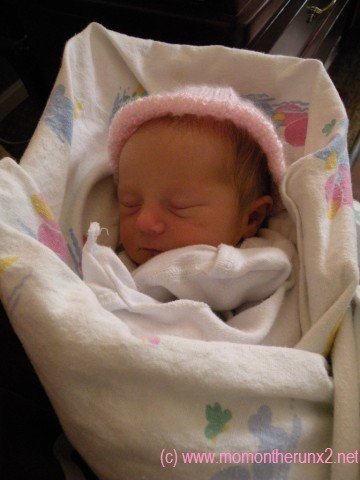 They pulled Mo out first– quiet as can be with her eyes open and taking in the world– at 1:25 pm. They had to wrestle Bo out– he came out screaming his little head off– at 1:27. Both were as healthy as could be and just a tad smaller than normal singleton babies. I managed to carry the twins to full-term. They didn’t even have to go to NICU!
