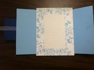 - Layer 3″ x 5″ light printed paper in center of medium printed paper for a writing area