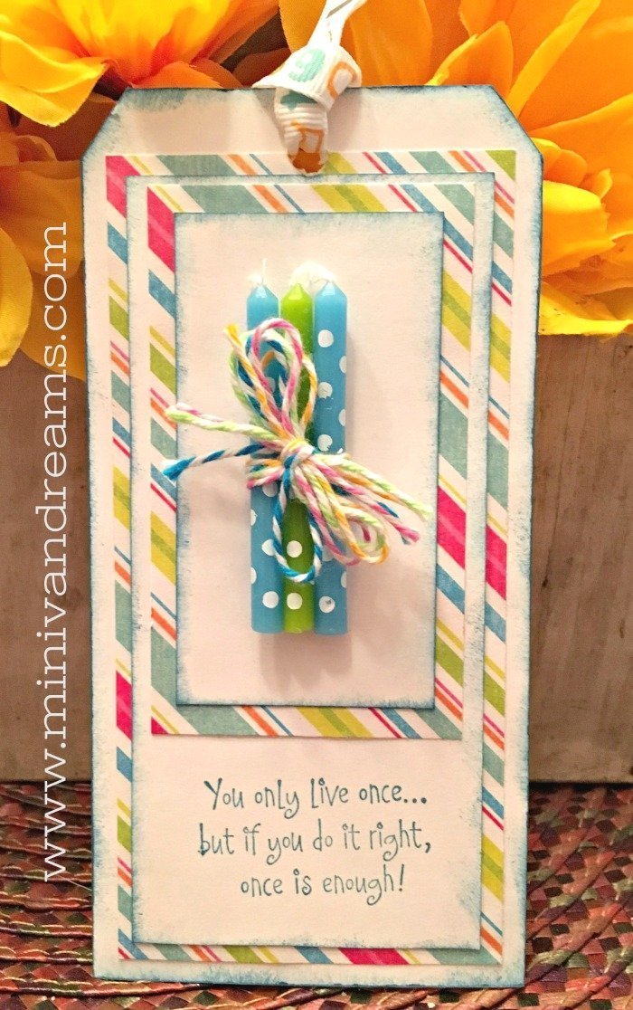 Have you ever gotten one of those gifts that someone wrapped beautifully – almost too pretty to open? They always have an amazing gift tag attached, right? Well, you can make your own easy birthday gift tag with some scraps and birthday candles – in less than 15 minutes! Jazz up the next birthday gift you give with this easy birthday gift tag and make a statement of your own!