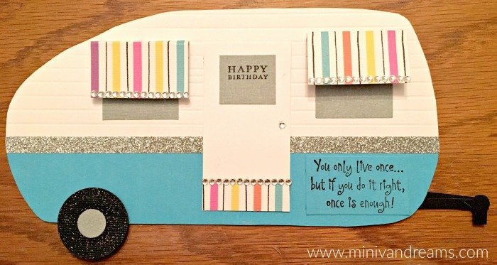 Check out this super cute retro camper birthday card! A friend of mine at work camps and when I was in search of a birthday card to enter in the fair, I stumbled across a camper card and decided to create something similar. I have always loved those retro, teal campers so I knew the color scheme would be perfect on the card. However, choose colors that your recipient loves to make it even more special!
