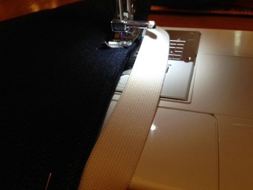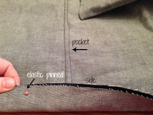 11. Using the ACTUAL width of your seat, cut a piece of elastic 2″ smaller. Pin elastic to the right side of the second main piece of fabric at the measurement you jotted down above.