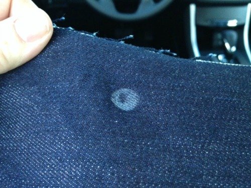 14. Back to your car… remove the seat head rest. Usually, this can be done by holding the retracting button (the button that makes it go back down) and pulling straight out. Place your seat cover on the seat, ensuring the elastic is in the correct place and the seat is evenly covered in the back. Using chalk or a fabric pen, mark the holes where the head rest posts go at the top of the seat cover (Remember, when we measured we measured to the center of the posts?) Return to the sewing machine and determine what size button hole you will need to make for the posts to fit through. Sew two button holes, one for each post. Cut fabric to create button hole.