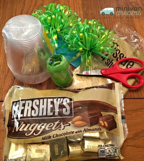 1. Place approximately 12 pieces of Hershey’s nugget candy in the plastic cup.