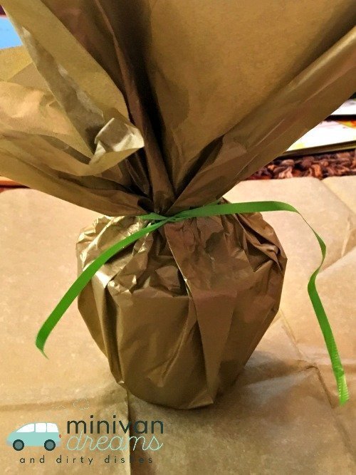 2. Center cup on tissue paper and gather ends together. Cut a 5″ piece of ribbon. Carefully, loosely tie ribbon around tissue paper as shown below.